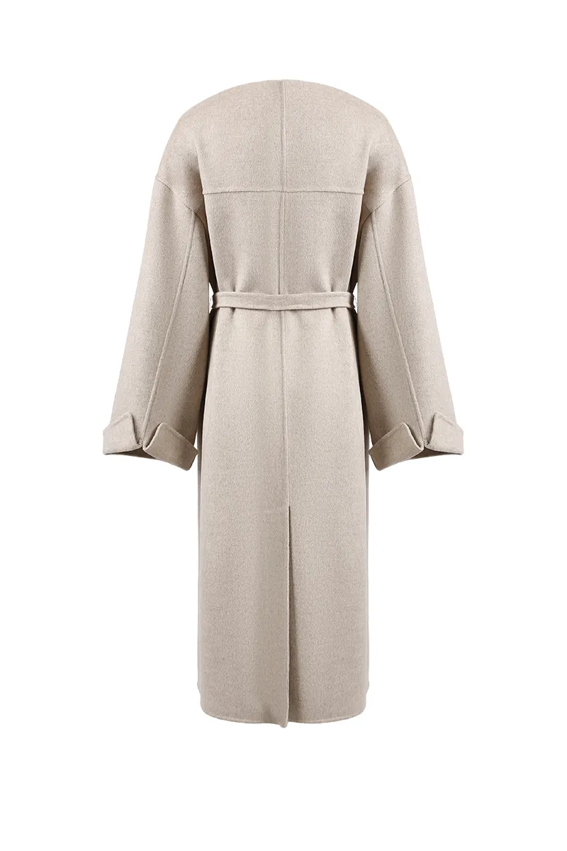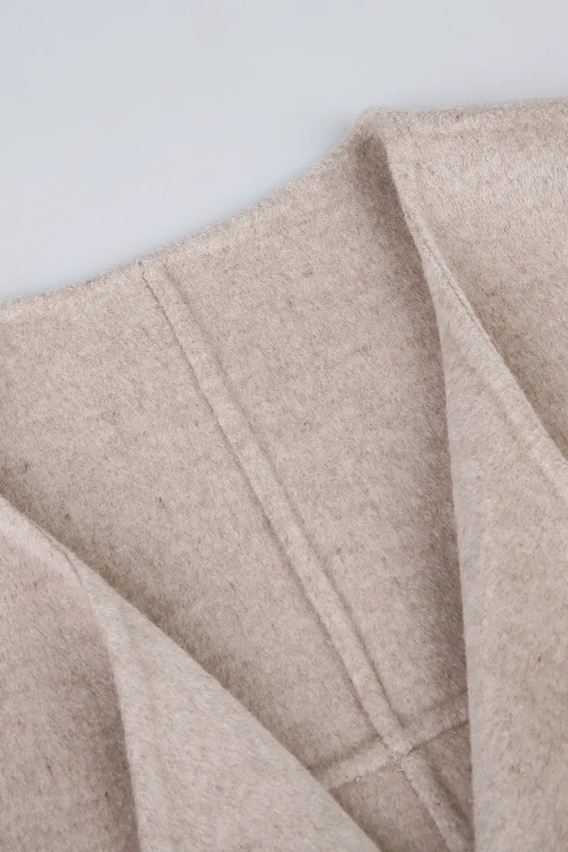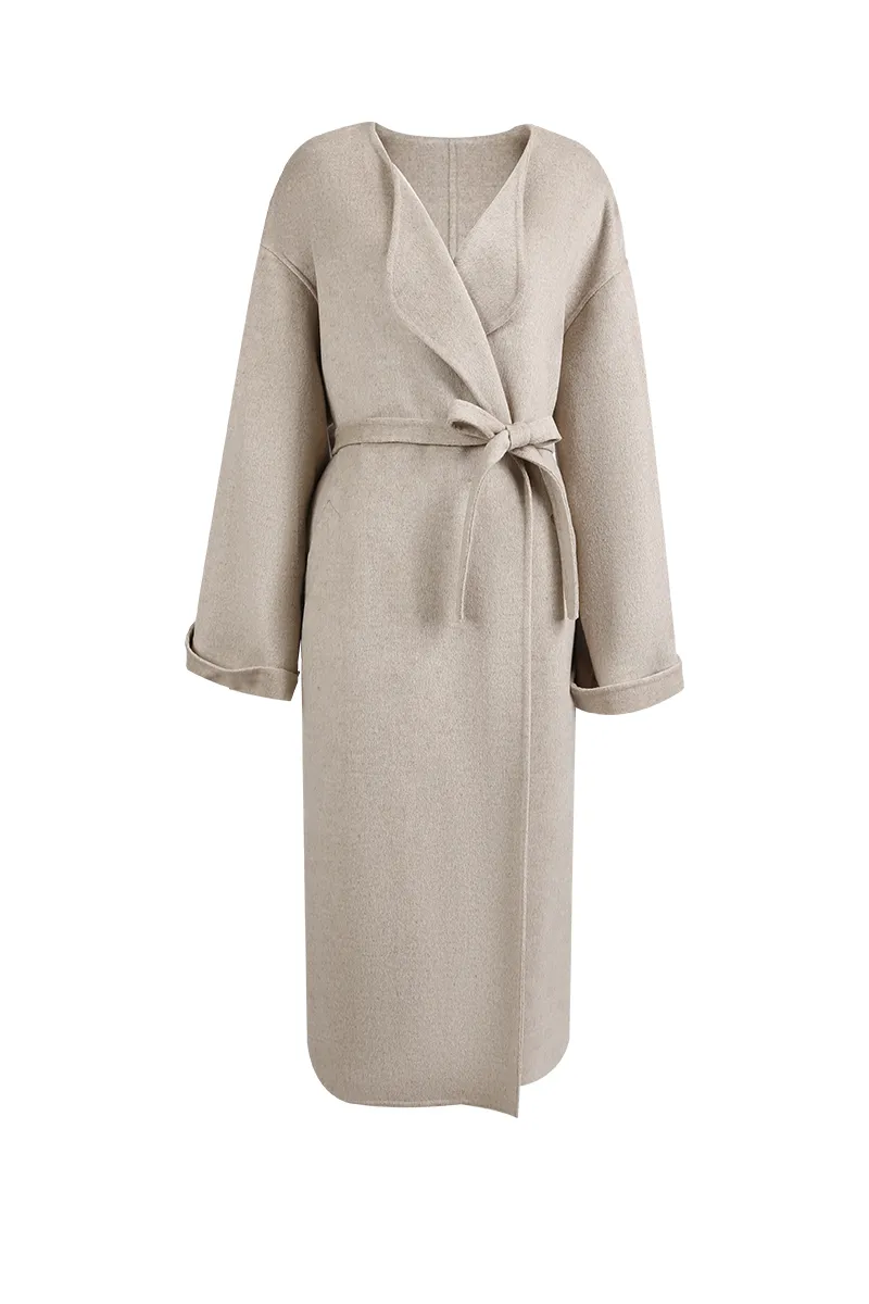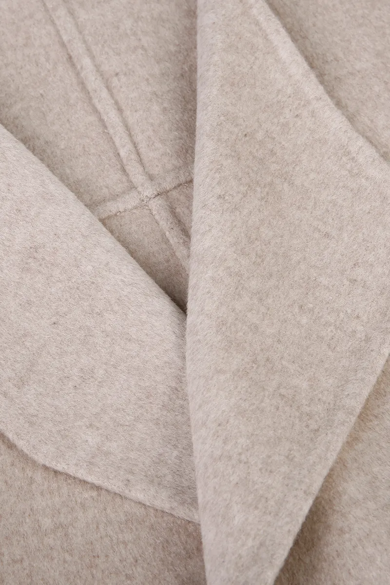 Méthode de commande : Taille standard * **Tissu :** Mélange laine-soie alliant luxe, fonctionnalité et praticité dans une matière haut de gamme. **Style :** Manteau femme à épaules tombantes, poignets retroussés, ceinture à nouer et encolure ample, pour une allure décontractée et naturelle.