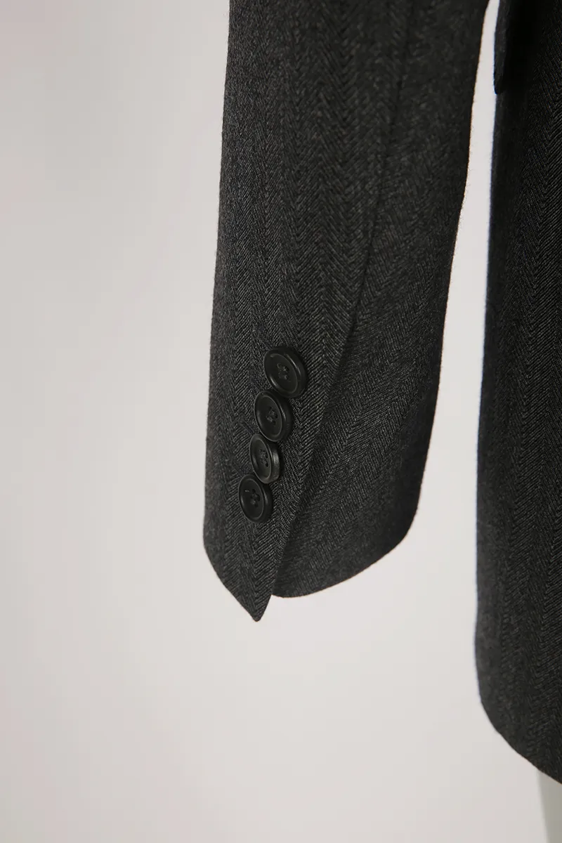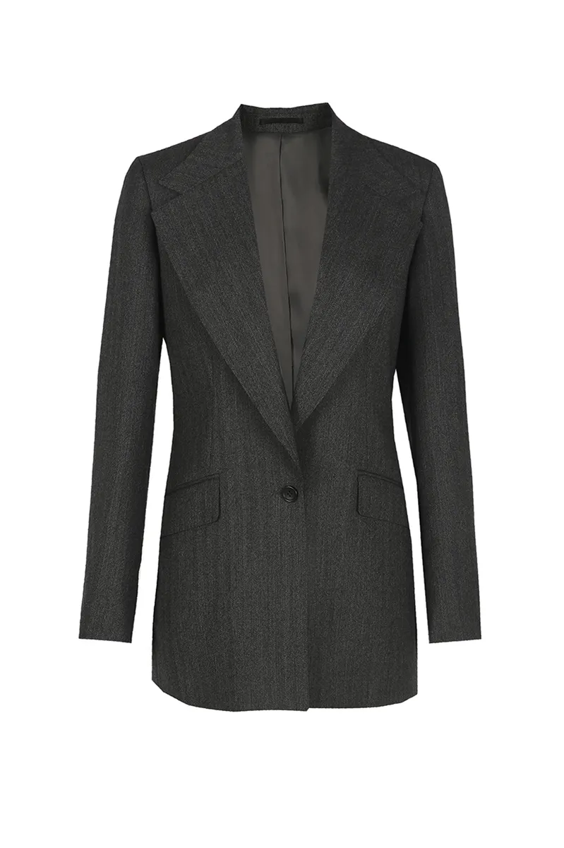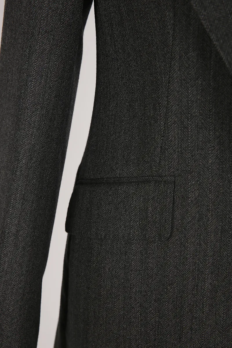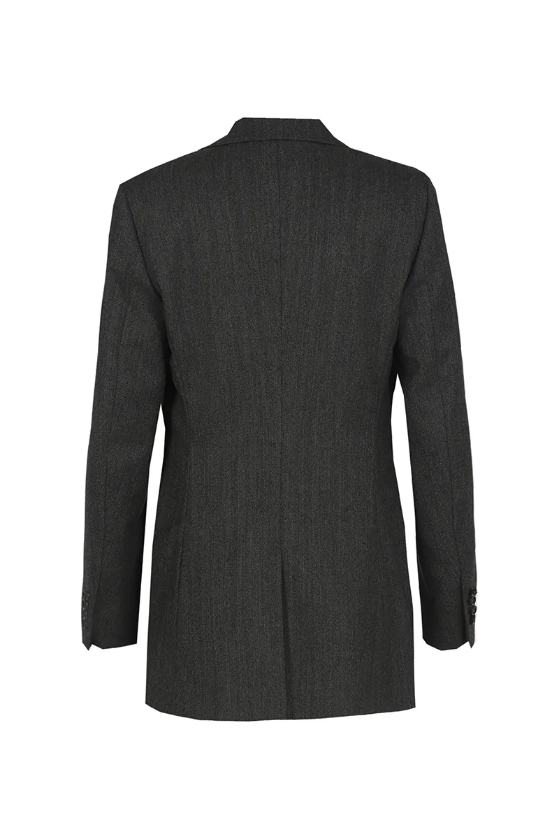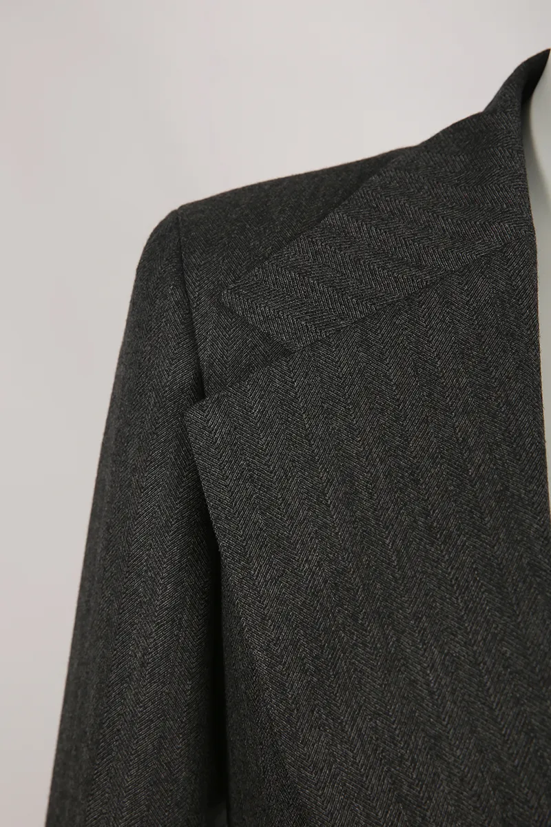 Coupe ajustée et cintrée, avec un revers cranté large et une fermeture croisée, mettant en valeur des détails distinctifs.